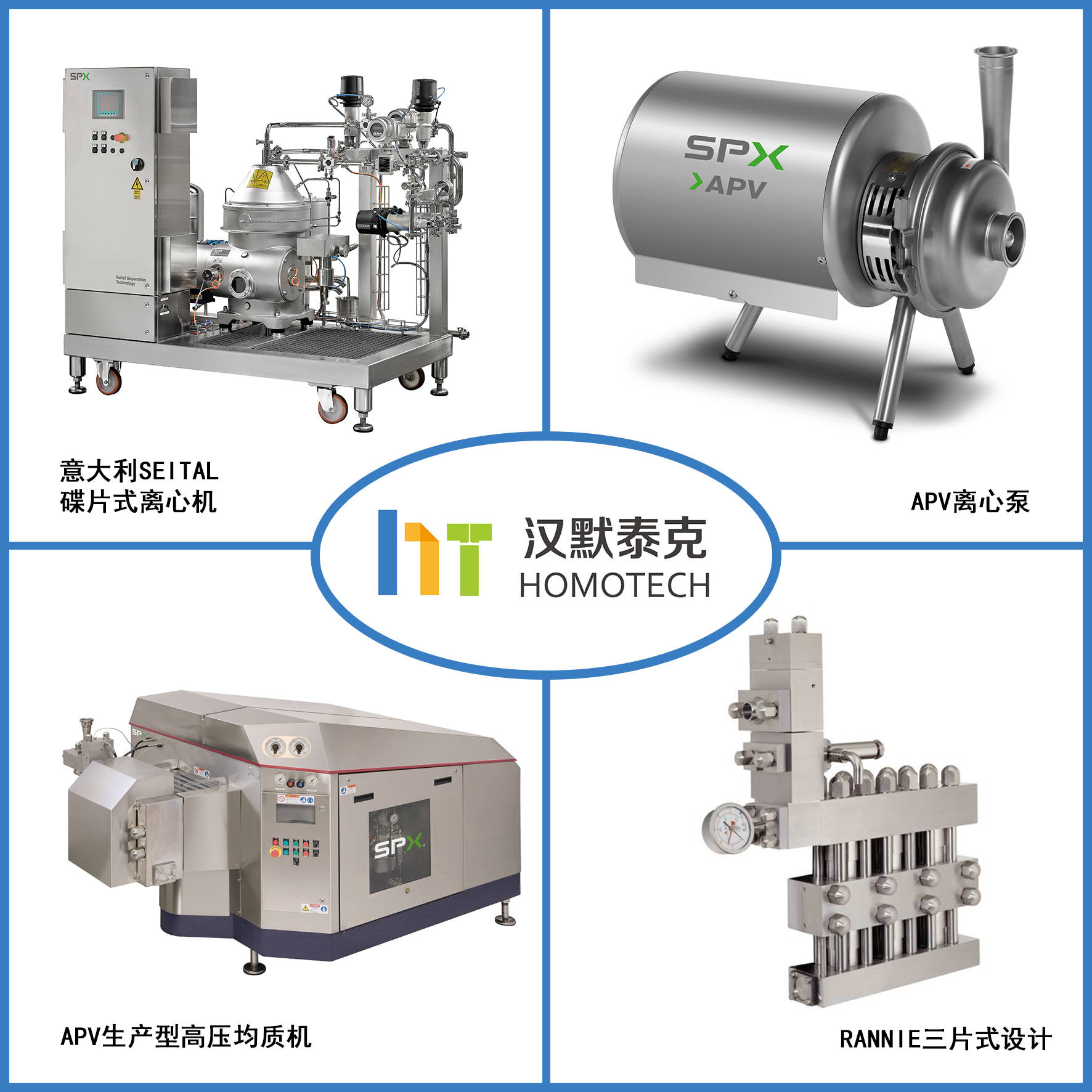 目前,本公司主要代理经营各类进口设备:SPX-APV公司的生产的各类应用设备(APV生产型高压均质机、APV实验高压均质机、Seital离心机、APV泵和阀门等);设备均为整装进口,品牌品质皆为行业内顶尖,产品应用涵盖化工、食品饮料、生化科技、乳制品、制药、个人防护用品等各大领域。 同时,为满足客户的需要,公司还与多家国内高端设备制造商建立合作,以适应国内食品、化工、制药及生物工程等领域对高、精、尖设备及技术日趋强烈的需求。